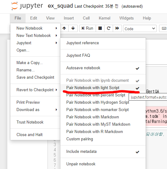 이미지에서 보이는대로 Pair Notebook with light Script 를 체크해주게 되면 이후에 어떻게 되는지 보자!!!