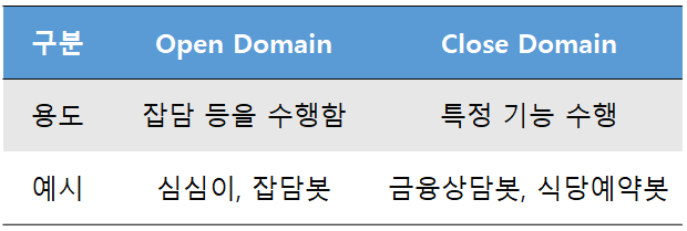 챗봇의 경우엔 2가지로 분류할수 있다. 자유롭게 대화할 수 있는 Open Domain 챗봇이 있고, 특정 목적을 수행하는 Close Domain 챗봇이 있다. close Domain 챗봇의 경우에는 사람의 업무를 도와줄 수 있는 개인 비서형 챗봇, 사내 업무 지원형, 고객 서비스 챗봇 등으로 구분되어 질 수 있다.