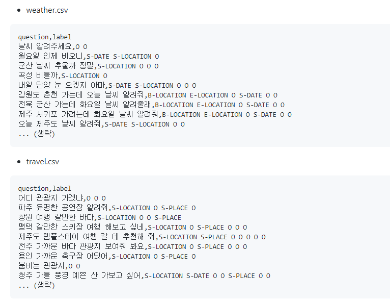 그래서 데이터를 학습하고 모델을 생성하여 새로운 데이터가 들어왔을때 문장 내에 어떤 의도를 가지고 있고 어떠한 개체가 무엇을 원하는지 체크한다. 데이터를 구하는게 정말 쉽지 않은 일인데 고맙게도 개발자가 데이터셋을 제공해주고 있다.