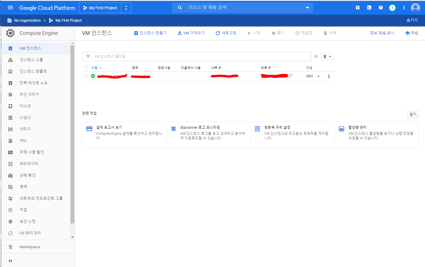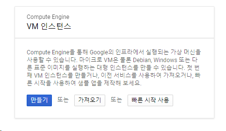 gcp에서 vm인스턴스를 누르게 되면 첫화면이 뜨게된다. vm이 하나도 없을때 뜨는 화면이다.
