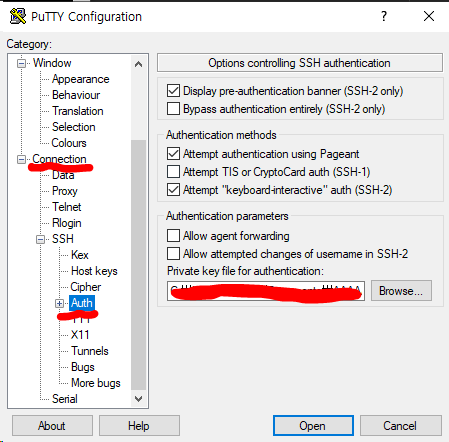 왼쪽 트리 리스트에서 Connection > Auth에 들어갑니다. 그리고 browse버튼을 통해서 아까 putty gen에서 저장했던 개인키를 찾아서 입력합니다. 그리고 난 후에 다시 왼쪽 트리리스트에서 세션으로 들어가 저장하고 접속을 시도하게 되면 접속이 됩니다~!