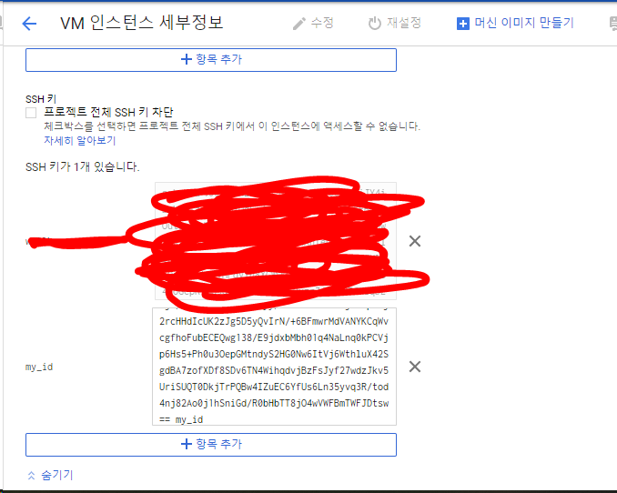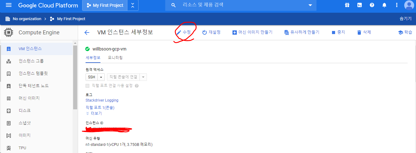 vm 머신의 세부정보로 들어와서 수정버튼을 누르고 난뒤