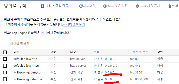 잠을 못자면서까지 작업하는 중에... 왠지모르게 gcp 방화벽규칙에 손이 갔다.