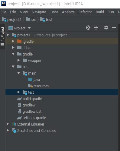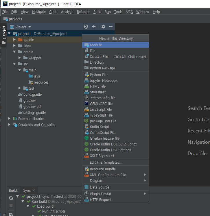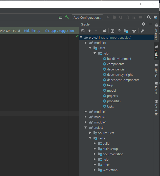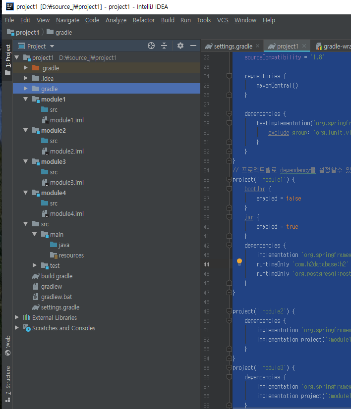 project1에는 빌드도 있고 여러가지 있는것을 볼수있는데 이제 gradle을 설정해서 모든 모듈에서 작업이 가능하도록 설정해보자.