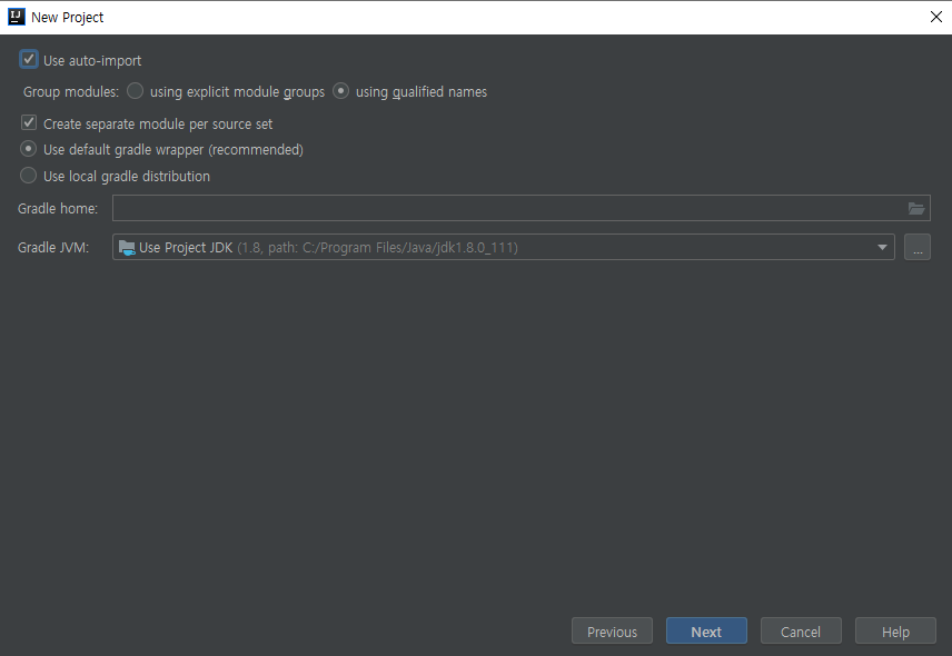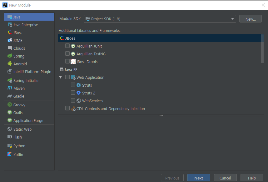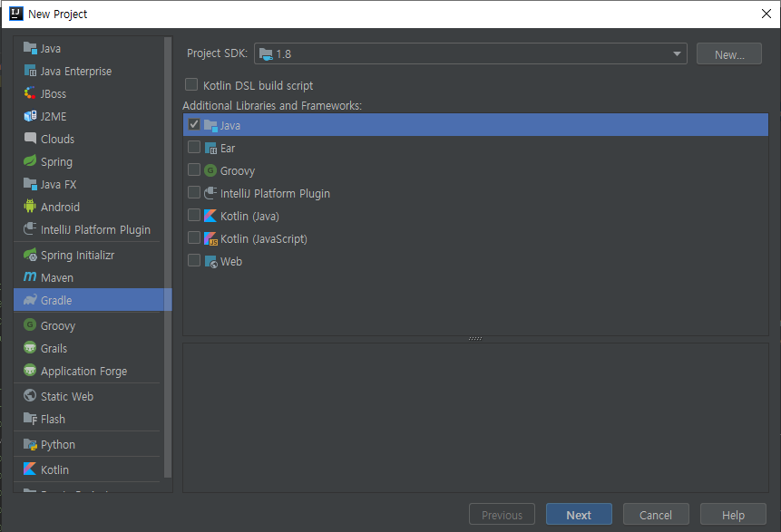 gradle은 멀티모듈을 지원하기 때문에 새로 만드는 모듈은 굳이 gradle로 설치할 필요는 없다. 그냥 java 모듈을 만들면 된다. 아무것도 선택하지 않아도 되고, 필요한 기능이 있다면 추가해도 될것이다.
