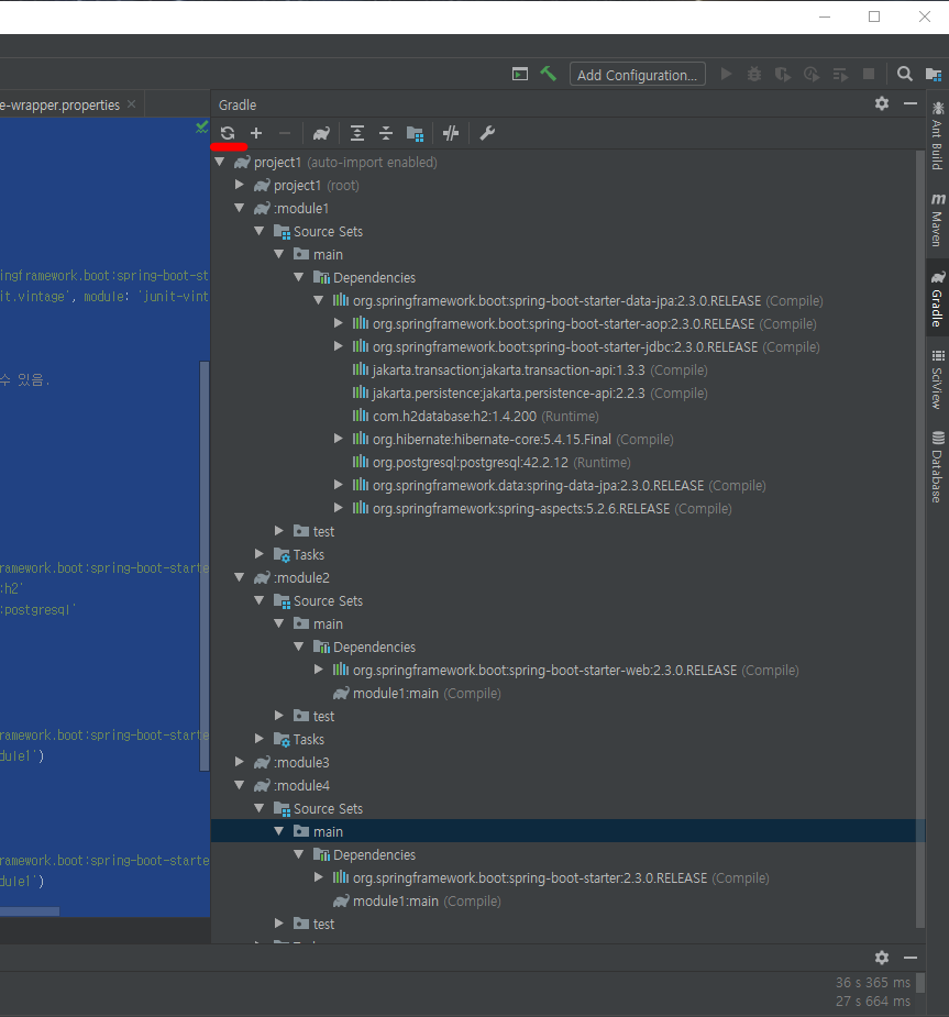 이렇게 한뒤 gradle 창에서 refresh버튼을 누르면 dependency 가 추가되어있는것을 확인할수 있다.